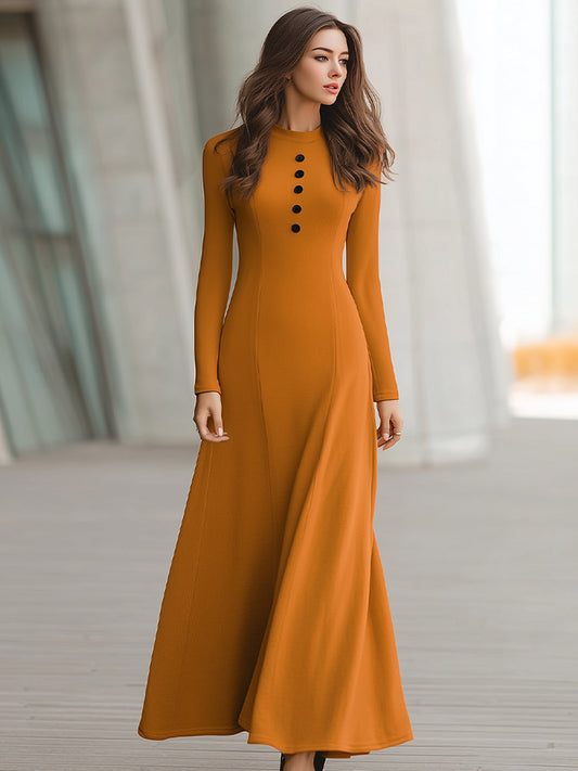 Elegant Orange Long Sleeve A-Line Maxi Dress With Button Detail