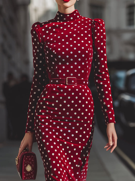 Vintage-Inspired Red Polka Dot Velvet Midi Dress